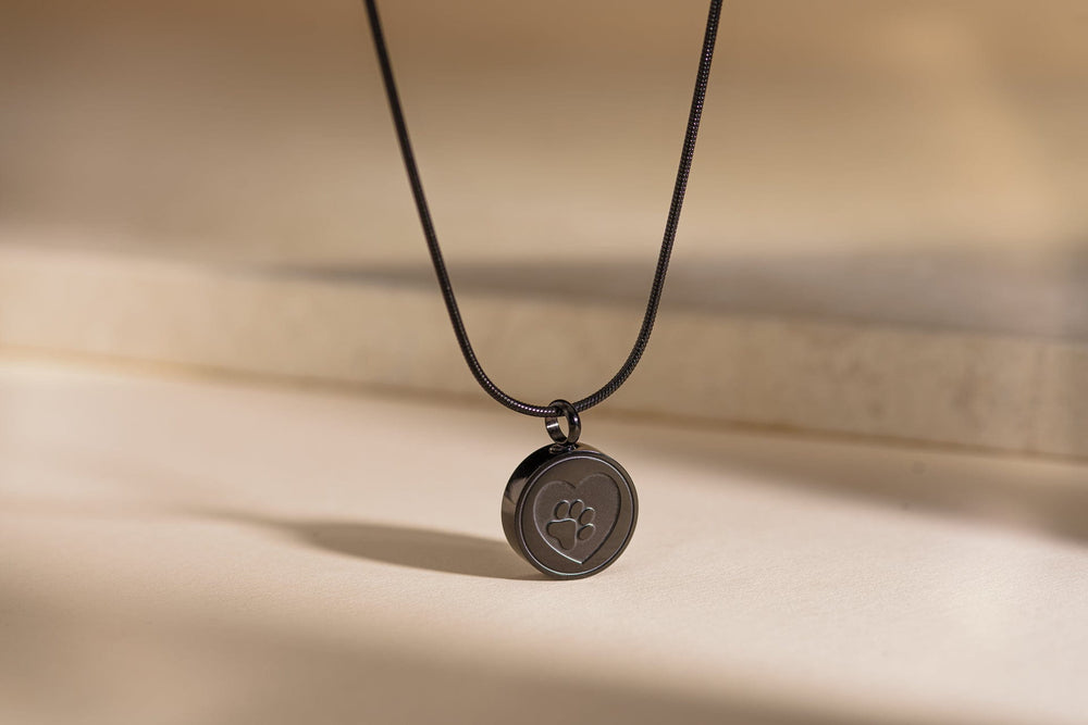 Gardez précieusement le souvenir de votre animal adoré grâce à ce collier funéraire – Patte, symbole délicat d'amour et de loyauté indéfectible. Fabriqué à la main en acier inoxydable de haute qualité et doté d'une jolie finition noire, ce pendentif renferme une petite portion sacrée des cendres de votre animal, créant ainsi un lien durable, où que vous soyez.