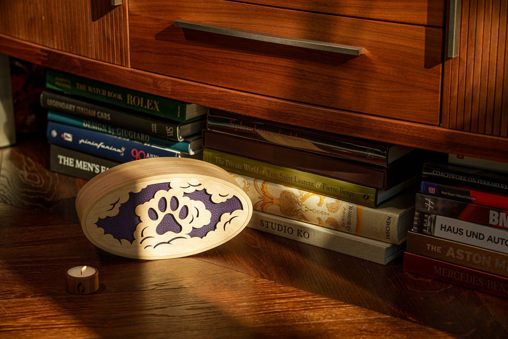 Handmade wooden pet cremation urn by Pulvis Art Urns.